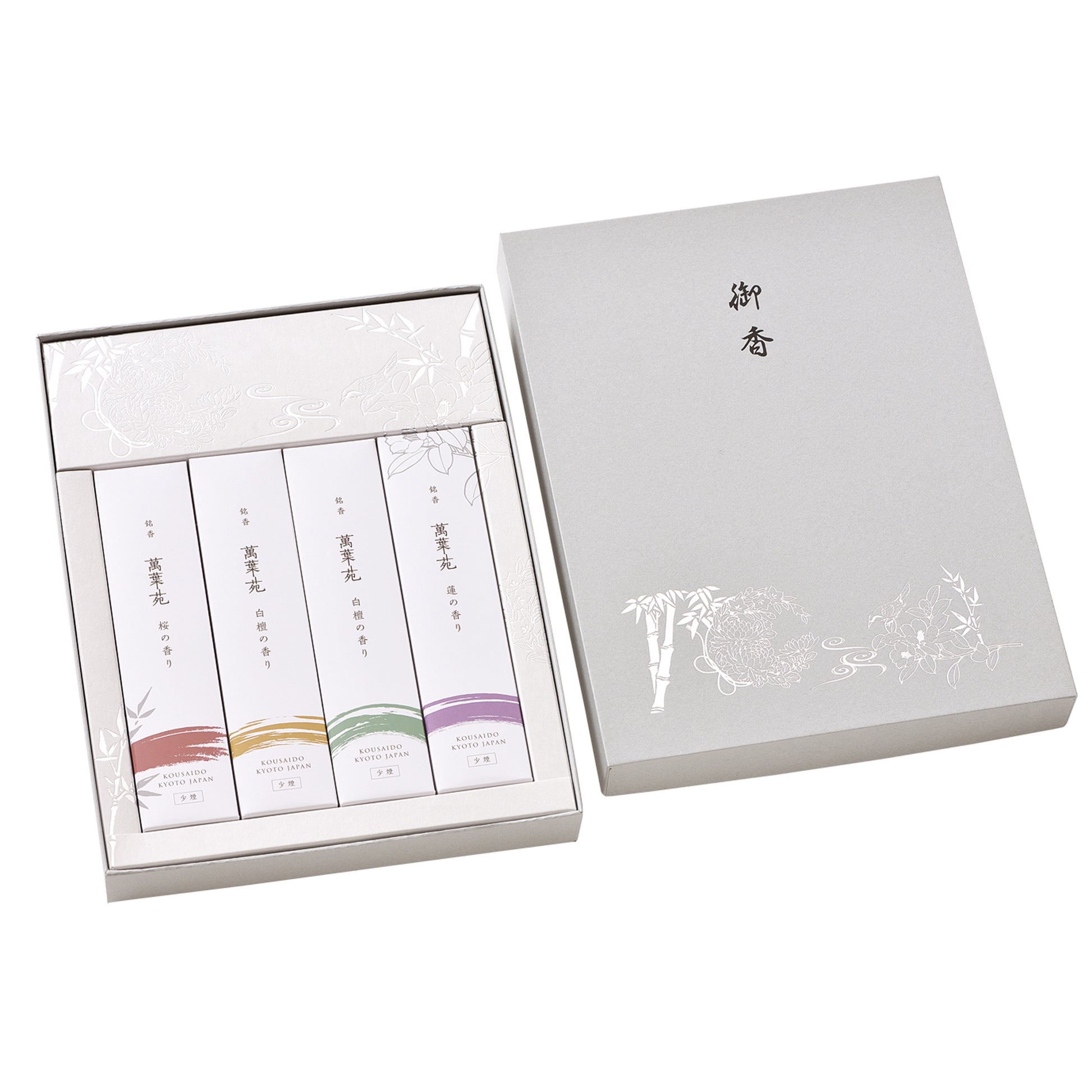 桜の香り:薄紅色に水面に映る、京の桜をイメージしたジャスミン・ベルガモット等を調合した京線香です。 白檀の香り:あらゆる草木や動物達が集う御仏の楽苑に、静かに佇む白檀の樹をイメージしました。 天然白檀を贅沢に配合した香り高い京線香です。 蓮の香り:白檀、はすの花などを調合し、極楽浄土に咲きほこる花々のほのかな甘さと美しさ、そして光に満ちた明るい世界を彷彿とさせる京線香です。