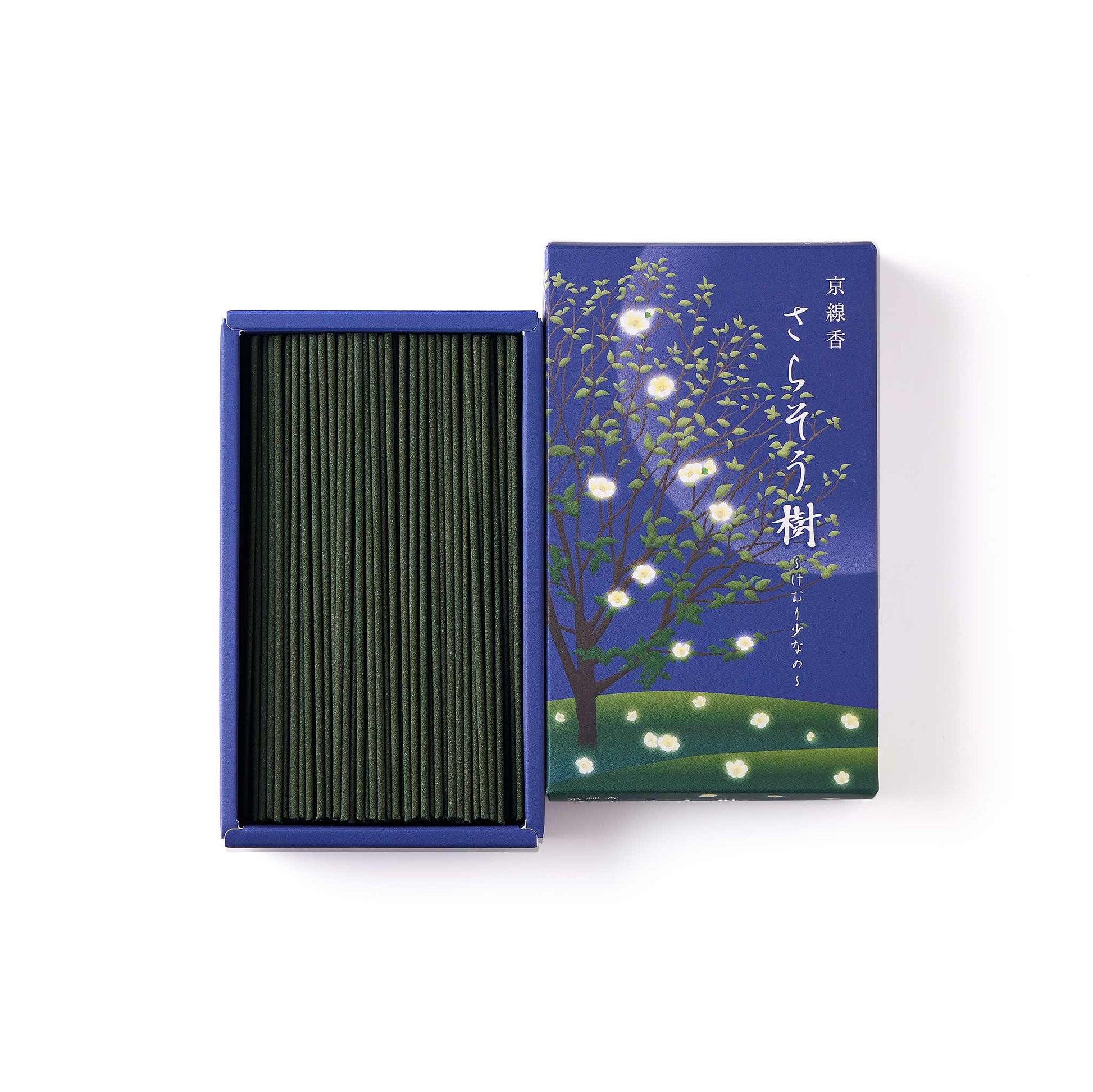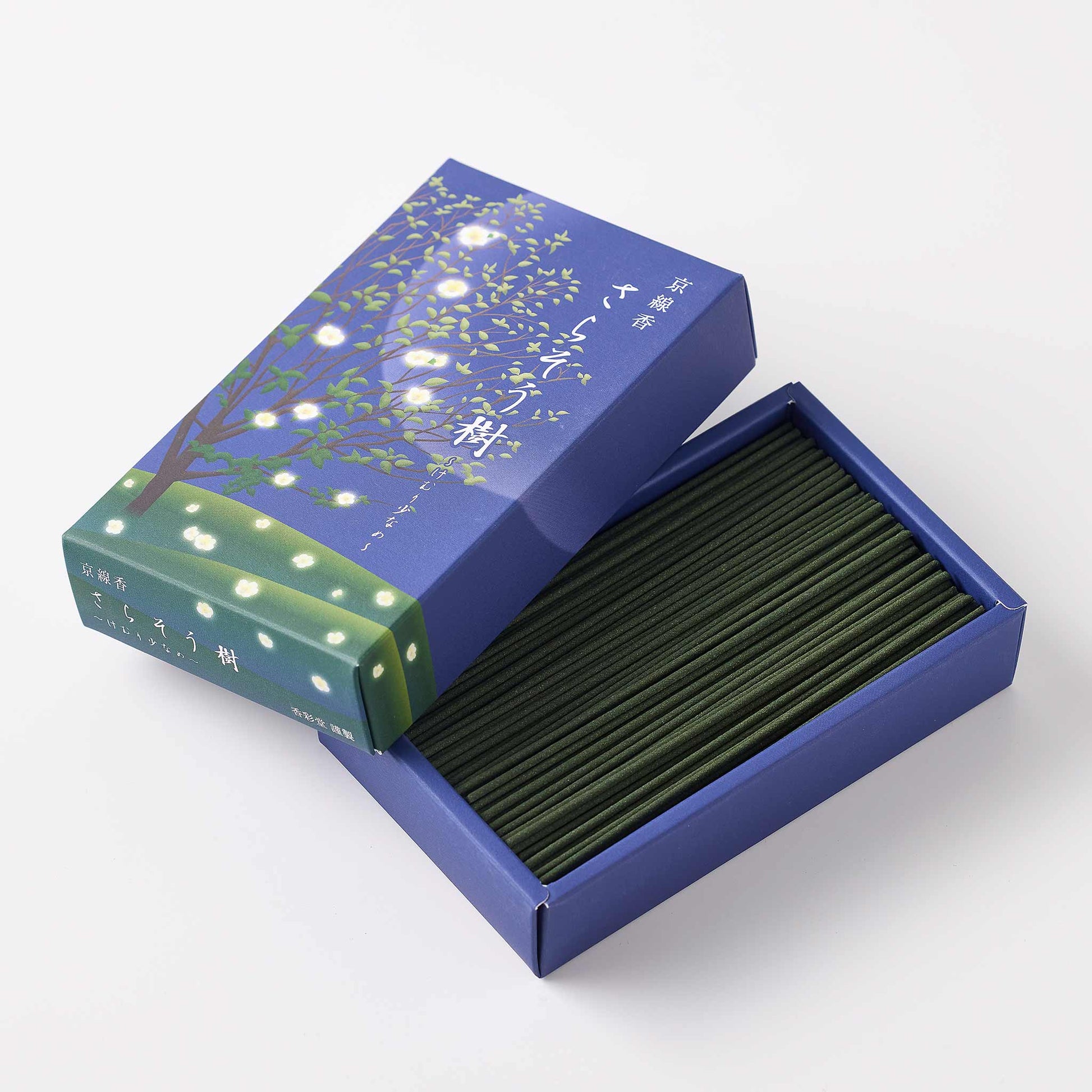 夜のとばりに静かに佇む沙羅双樹をイメージして原料にこだわって調合しました。 白檀をベースにマグノリア・ライチ等を調合した爽やかな香りの、煙の少ない京線香です。 お仏前用として、またお部屋用として幅広くお使い下さい。